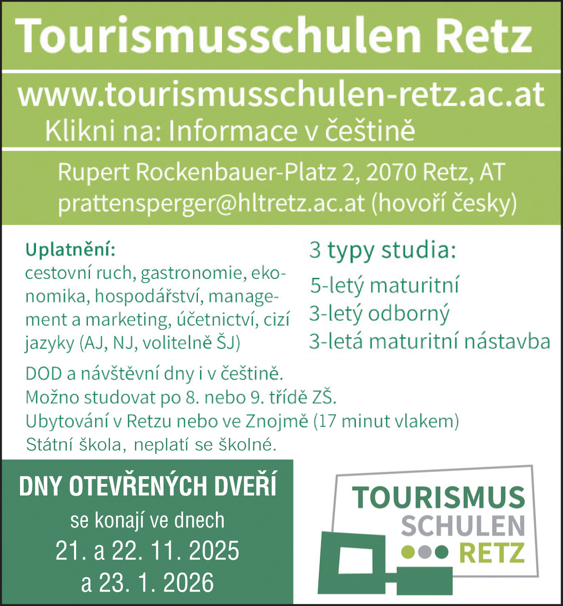 Střední škola cestovního ruchu a odborná škola turismu v Retzu, Rupert Rockenbauer Platz 2, pořádají Den otevřených dveří ve dnech 21. listopadu 2025 (od 14.00 do 18.00 hodin) a 22. listopadu 2025 (od 9.00 do 14.00 hodin).