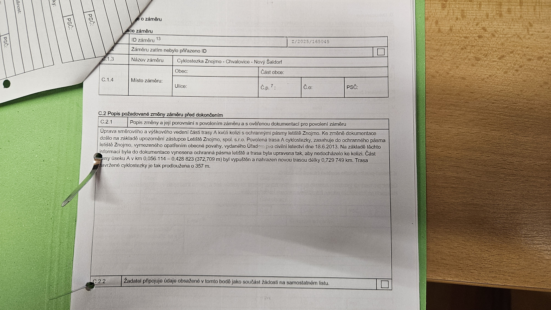 Město Znojmo proto letos v září podalo žádost o změnu stavby před dokončením. Dokument, který podepsal vedoucí odboru investic Karel Bartušek, uvádí, že původní trasa cyklostezky zasahovala do 3D ochranných prostorů letiště stanovených opatřením obecné povahy ÚCL z července 2013. V žádosti se konstatuje, že část trasy v délce 372 metrů musí být zcela vypuštěna a nahrazena novým, téměř dvojnásobně dlouhým úsekem o délce 730 metrů. Projekt se tak prodlužuje o necelých 360 metrů a zároveň zasahuje do už rozestavěné stavby, která musí být částečně přeprojektována a přestavěna.