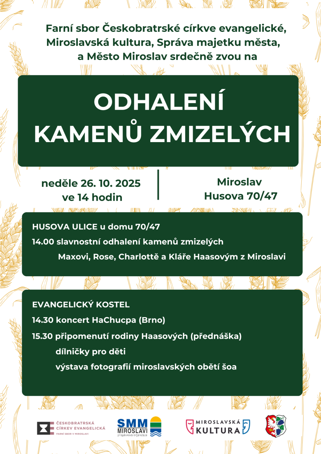 Slavnostní odhalení začne ve 14 hodin u domu Haasových. Od 14.30 bude v evangelickém kostele následovat koncert brněnského souboru HaChucpa, který se už od roku 1997 věnuje interpretaci židovské hudby a kultury. Po koncertu proběhne přednáška o historii rodiny Haasových. Součástí odpoledne bude i program pro děti a výstava o dalších miroslavských obětech šoa.