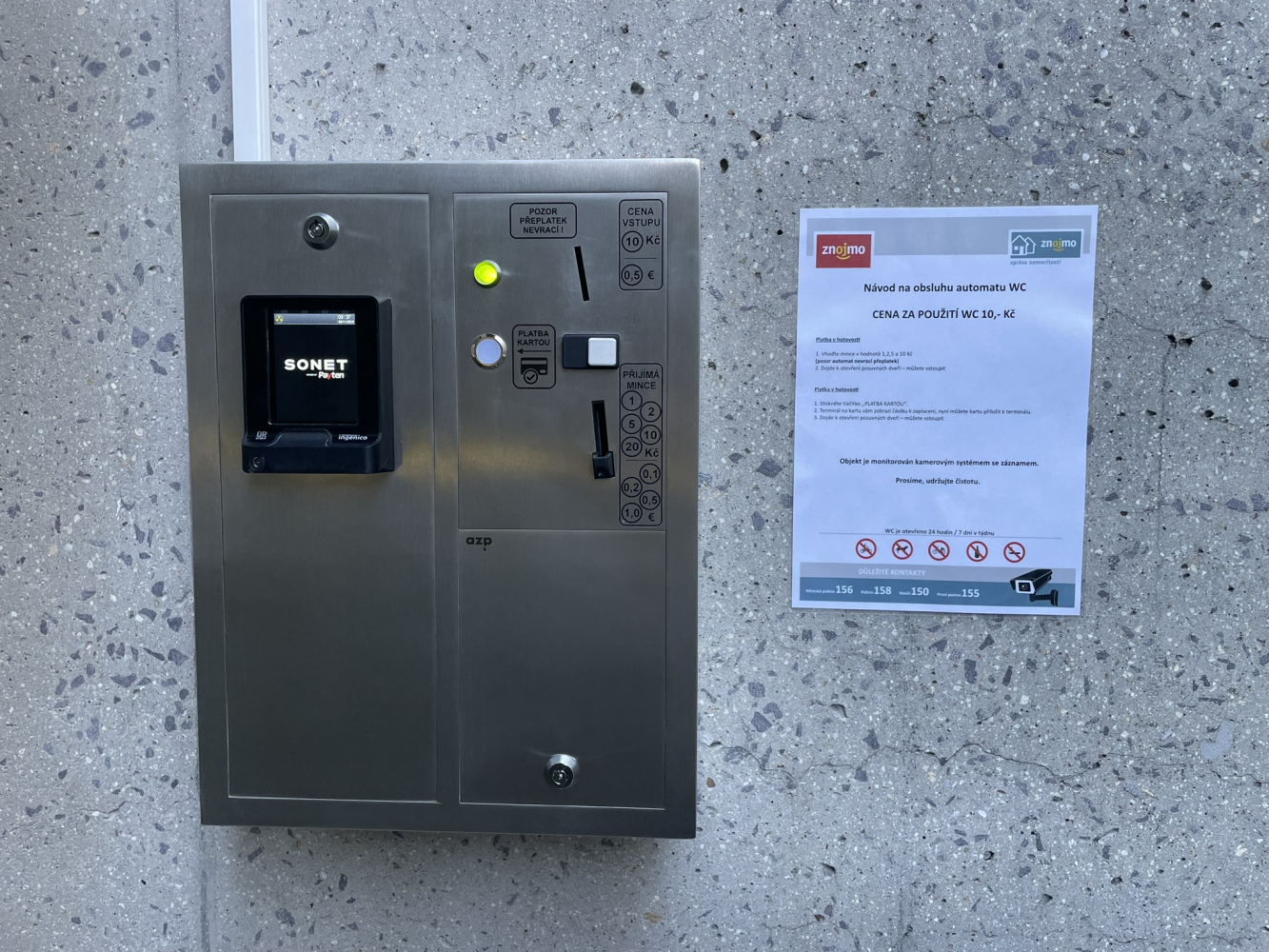 Veřejné toalety ve Znojmě nově bez obsluhy – platba přes automat hotově i kartou, otevřené nonstop.