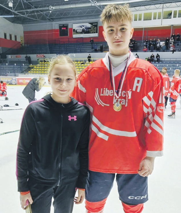 Dominik se zlatou medailí a Nellou Zimmermannovou - hokejistkou mladších žáků Orlů Znojmo.
