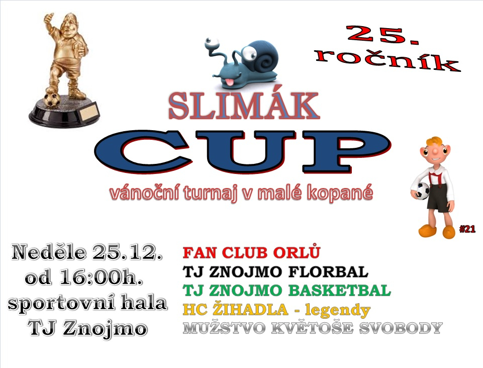 V neděli 25.12. od 16h. se uskuteční ve sportovní hale TJ Znojmo na ulici J.F.Curie již 25. ročník vánočního turnaje v malé kopané s názvem SLIMÁK CUP.