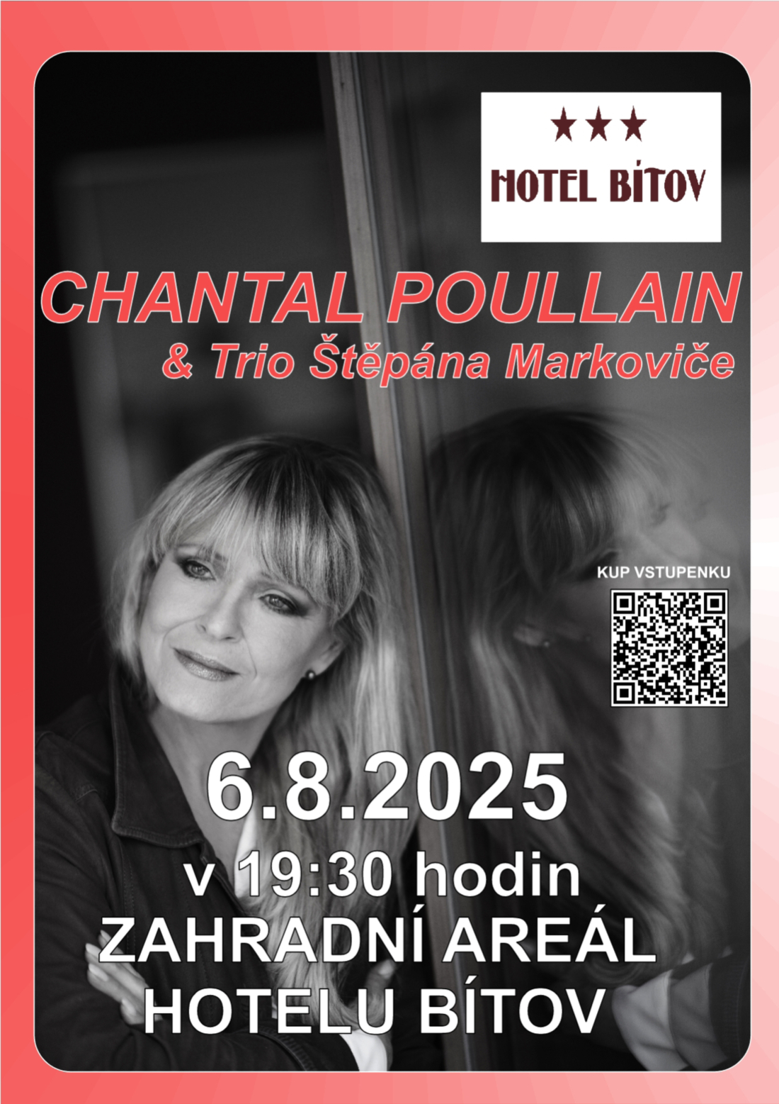 BÍTOV Příznivci kvalitní hudby se mohou těšit na výjimečný kulturní zážitek. Ve středu 6. srpna 2025 od 19.30 hodin vystoupí v zahradním areálu Hotelu Bítov francouzská šansoniérka Chantal Poullain společně s Triem Štěpána Markoviče.