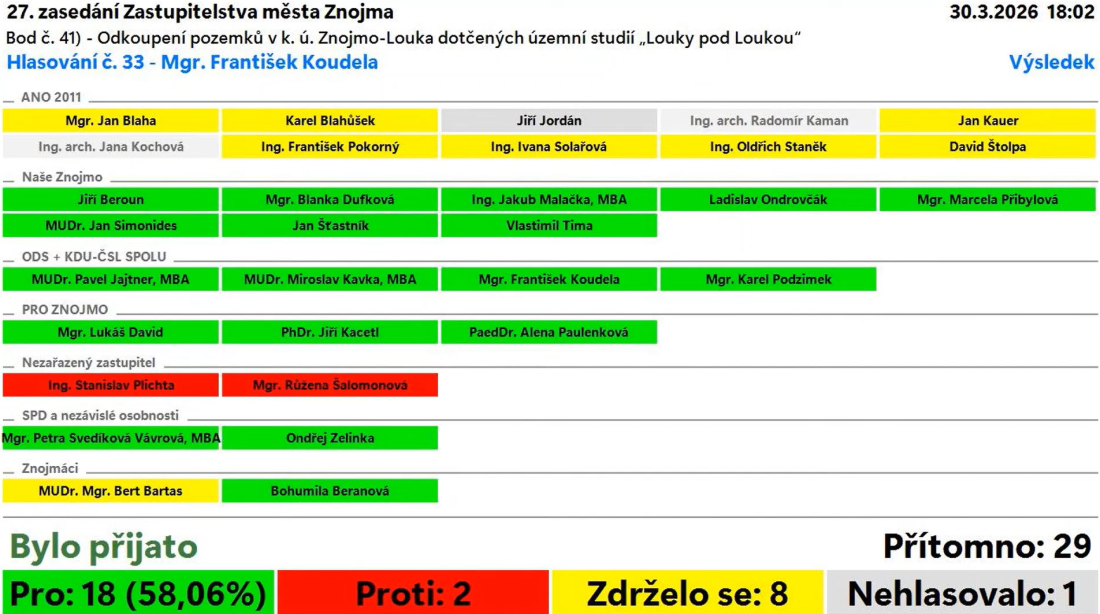 Pro odkup pozemků hlasovalo všech 16 koaličních zastupitelů a dva opoziční. Zbytek se zdržel, byl proti, nebo vůbec nehlasoval.