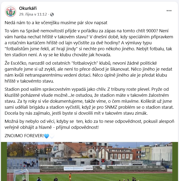 Ve svém textu kritizovali zejména Správu nemovitostí města Znojma (SNMZ), která stadion provozuje, a obvinili město, že k fotbalu přistupuje macešsky. „Že Escéčko, narozdíl od ostatních ‚fotbalových‘ klubů, nevoní žádné politické garnituře, jsme si už zvykli, ale není to přece důvod je šikanovat. Něco jiného je nedat nám kvůli netransparentnímu vedení dotaci. Něco úplně jiného ale je předat klubu hřiště v takovémto stavu,“ napsali Okurkáři, kteří v závěru vyzvali, aby ten, kdo za stav stadionu nese odpovědnost, alespoň veřejně vystoupil a přijal odpovědnost.