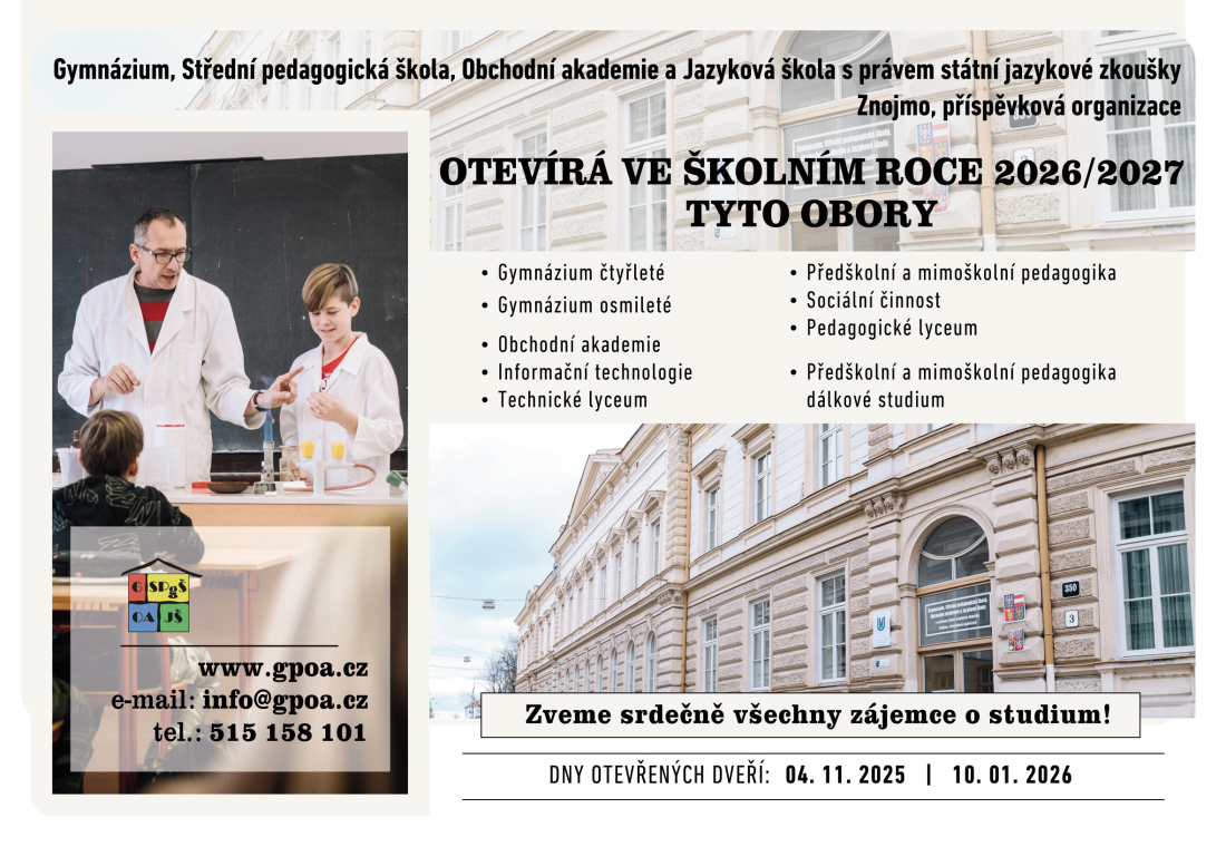 V sobotu 10. ledna 2026 se od 9.00 do 17.00 hodin uskuteční Den otevřených dveří Gymnázia, Střední pedagogické školy, Obchodní akademie a Jazykové škola s právem státní jazykové zkoušky Znojmo, p. o., který je určen především žákům pátých a devátých tříd a jejich rodičům. Škola tak naváže na pozitivní zkušenosti z předchozích let a nabídne možnost detailně se seznámit s nabídkou studijních oborů i s podobou přijímacího řízení.