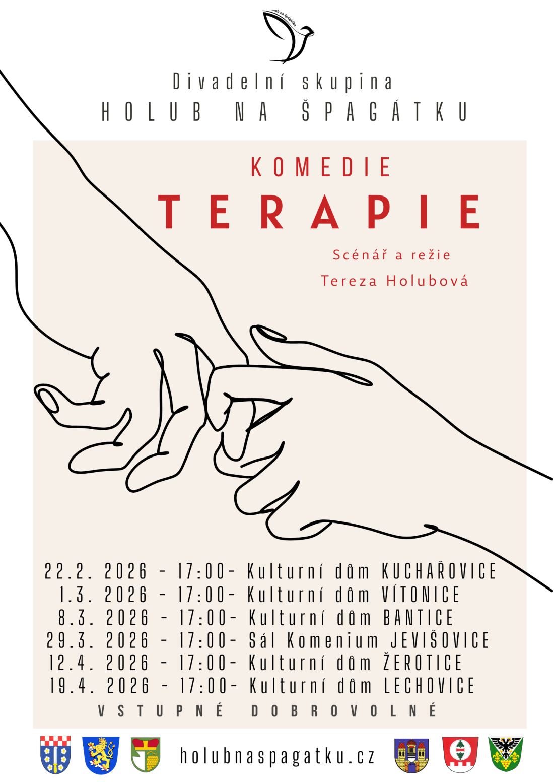 „S Terapií máme za sebou první divadelní tour, při které jsme navštívili pět dědin znojemského okresu. Nevěděli jsme, jestli se bude hra líbit, jestli na nás diváci přijdou. Velmi mile nás překvapily srdečné reakce a ohlas. Proto od února vyrážíme zase. Tentokrát nás čeká šest obcí. Naším cílem je lidi pobavit, strávit s nimi hezký večer a přiblížit jim naše divadlo. Všem starostům obcí mockrát děkujeme za podporu a spolupráci,“ prozradila scenáristka a režisérka hry Tereza Holubová.