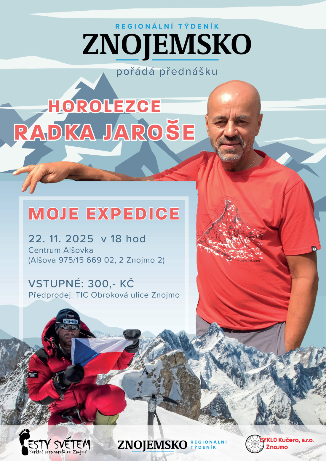 Regionální týdeník Znojemsko ve spolupráci s Bronislavem Mikuláškem zve všechny milovníky hor, dobrodružství i lidské odvahy na besedu s předním českým horolezcem Radkem Jarošem. Přednáška s názvem Moje expedice se uskuteční v sobotu 22. listopadu 2025 od 18.00 hodin v Centru Alšovka ve Znojmě.