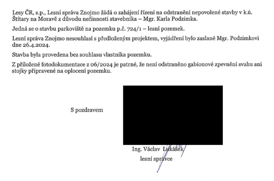 Jak Znojemsko informovalo, spor se týkal mimo jiné nepovolené stavby parkoviště na pozemcích Lesů ČR, jejímž stavebníkem byl krajský radní Karel Podzimek (ODS). Lesní správa Znojmo přitom v roce 2024 jednoznačně požadovala odstranění stavby (viz foto níže), která vznikla bez souhlasu vlastníka pozemku.