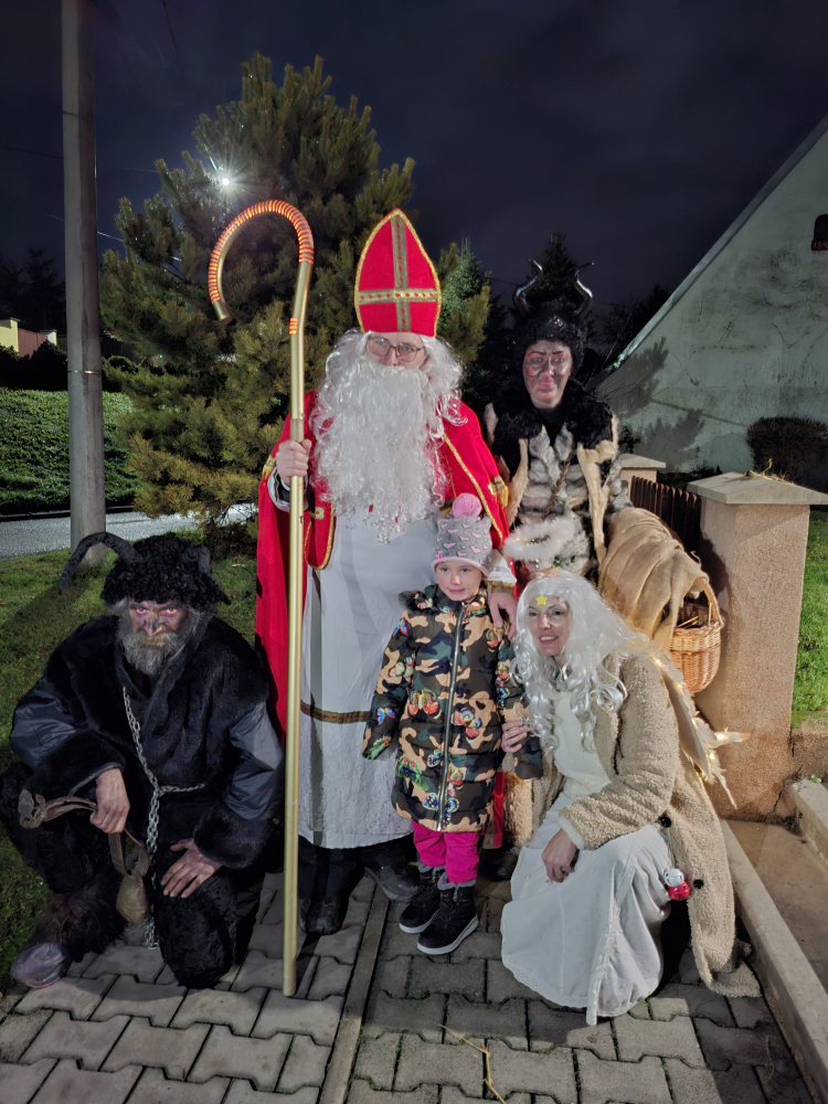 Poté přišel Mikuláš. Každé naše dítě dostalo od obce balíček s dobrotami. Snad si na nich smlsnou. A půjčili jsme si andílka, Mikuláše a čerty ze sousedních Rudlic. Super parta, masky věrohodné, přístup k dětem velmi laskavý. Nejdříve ukápla nějaká ta slzička, potom ale vše dobré, za básničku byly i další dobroty.