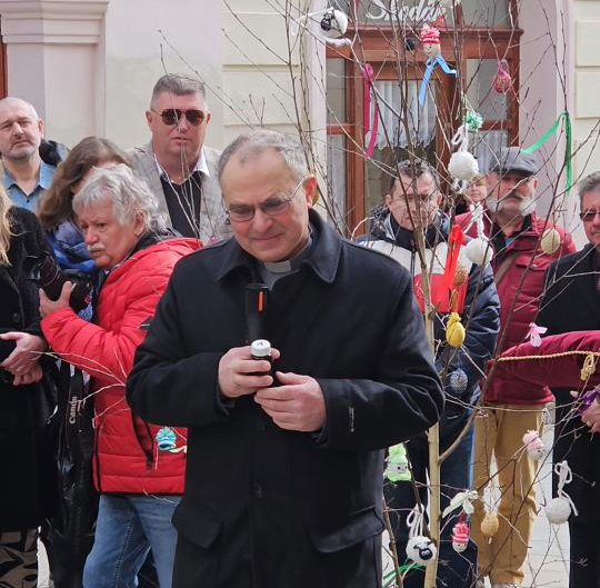 „Jde o symbol toho, aby práce, která do ní byla lidmi vložena, dostala očištění,“ vysvětlil Jindřich Bartoš. V krátké modlitbě poprosil o požehnání také pro všechny, kteří ji vidí jen z dálky, nebo kolem věže procházejí či si ji nesou ve svých vzpomínkách. Poté vytáhl malou lahvičku se svěcenou vodou přinesenou z kostela svatého Mikuláše a pokropil pamětní desku ve spodní části věže.
