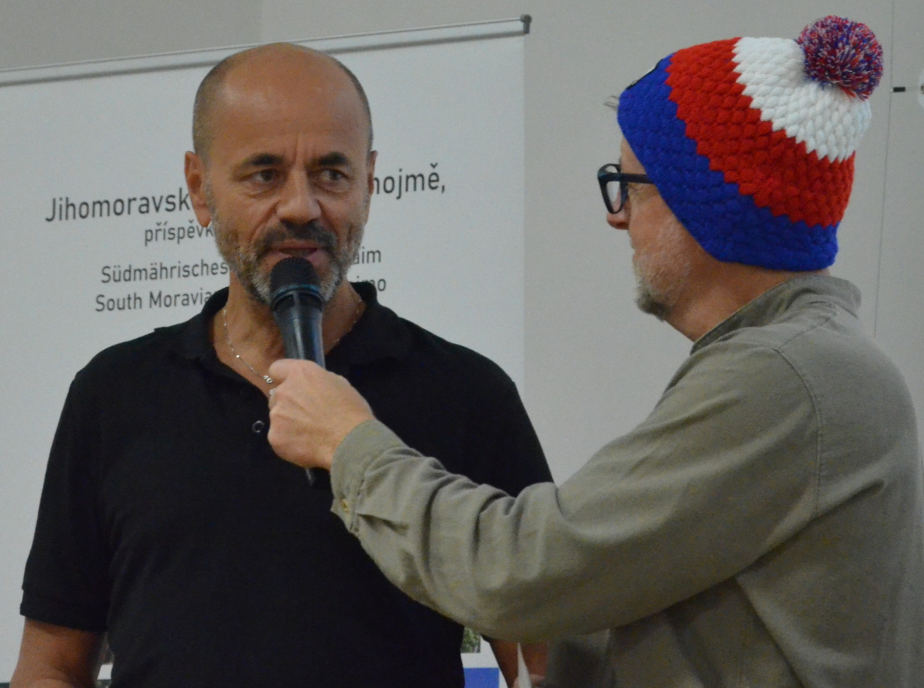 V krátkém úvodu odpovídal horolezec na řadu otázek znojemského cestovatele Bronislava Mikuláška. Otázek přímo na tělo. Někdy i na těla jiných. Konkrétně dívek a žen. Jaroš bez výmluv přiznal, že je dolňák.