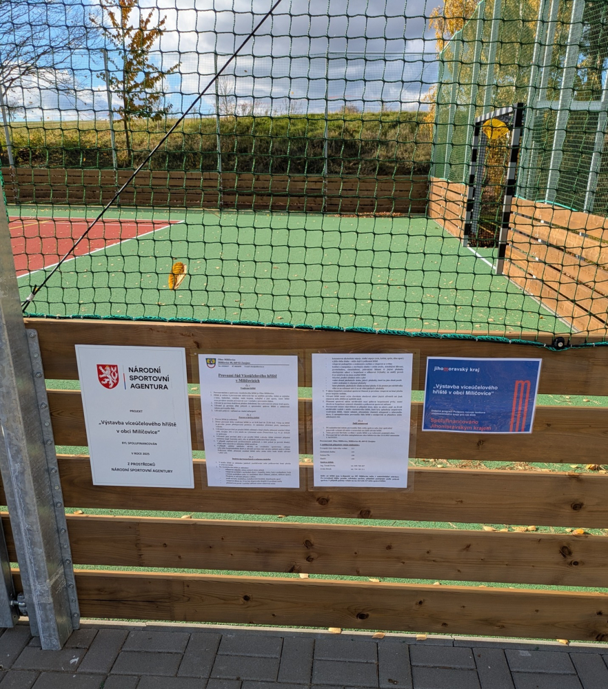 Multifunkční hřiště, které je umístěno za obcí, září už z dálky novotou i pestrými barvami podle typu sportovního povrchu. Směle tak konkuruje podzimní krajině. Areál je chráněn vysokým pletivem a dřevěným hrazením a na sociálních sítích už sklízí samé pozitivní ohlasy. „Super! Už máme kde rozvlnit ta naše velká těla,“ komentoval s nadsázkou místní obyvatel Jan Vlašic.