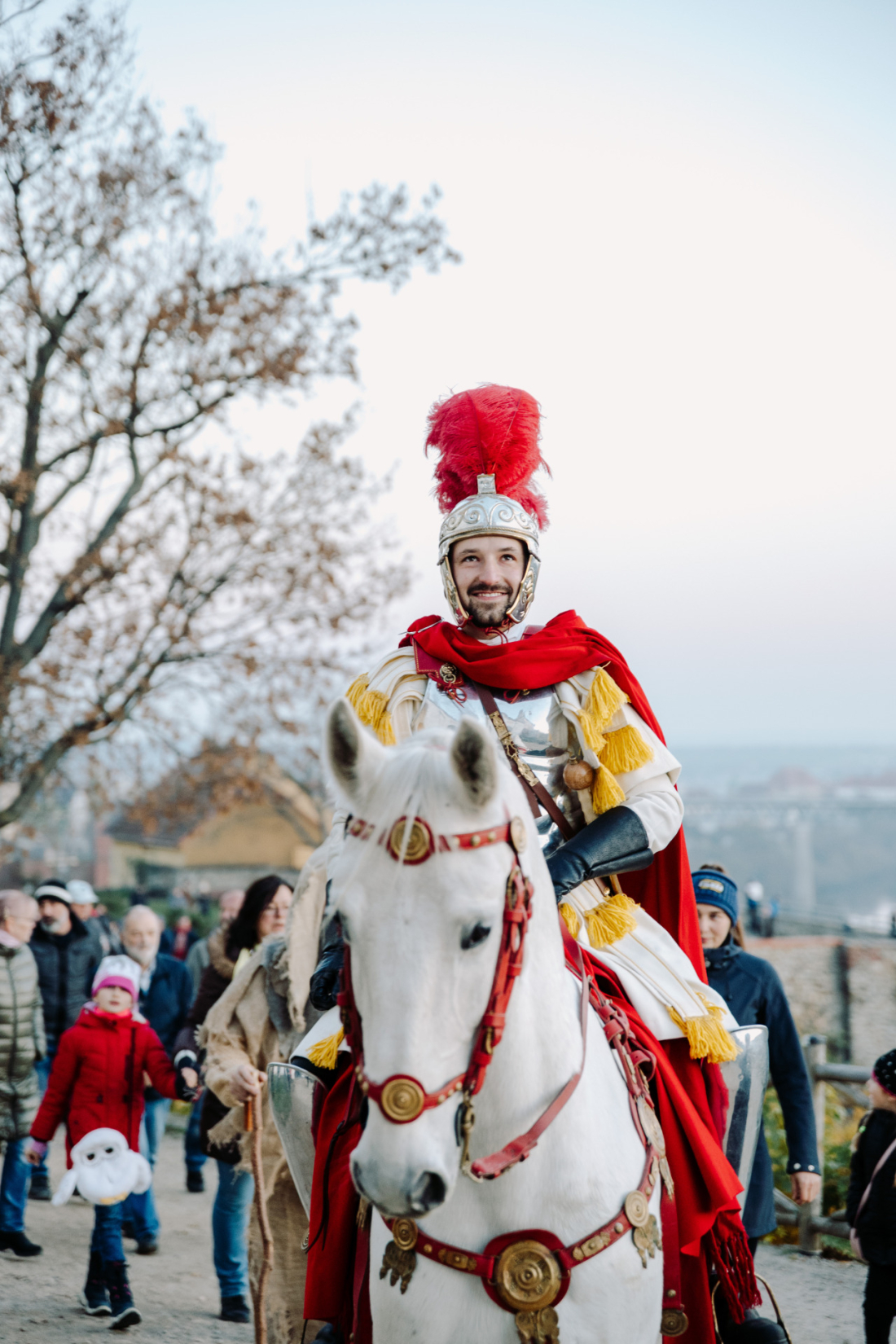 Svatý Martin dorazí do Znojma na bílém koni hned dvakrát – v 16.00 a 17.00 hodin. Průvod vyrazí od pobočky ČSOB na Masarykově náměstí a přenese návštěvníky do dávných časů. Průvod bude provázet pověst o svatém Martinovi doplněná o živou scénku, v níž mečem bude rozdělen plášť, jehož polovina bude věnována žebrákovi jako gesto, které dodnes symbolizuje lidskost a štědrost.