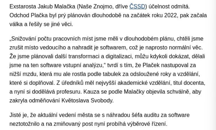 Když na podzim 2022 končila radnice vedená tehdejším starostou Jakubem Malačkou (dříve ČSSD, dnes Naše Znojmo), z městského úřadu odešel po téměř dvanácti letech vedoucí interního auditu Michal Plaček (dříve ČSSD). Ten získal odstupné ve výši téměř půl milionu korun.