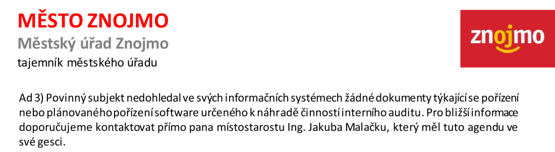 Město tedy oficiálně žádné vstupní analýzy, studie ani jiné dokumenty týkající se nahrazení funkce vedoucího interního auditu softwarem nemá ani nemělo.