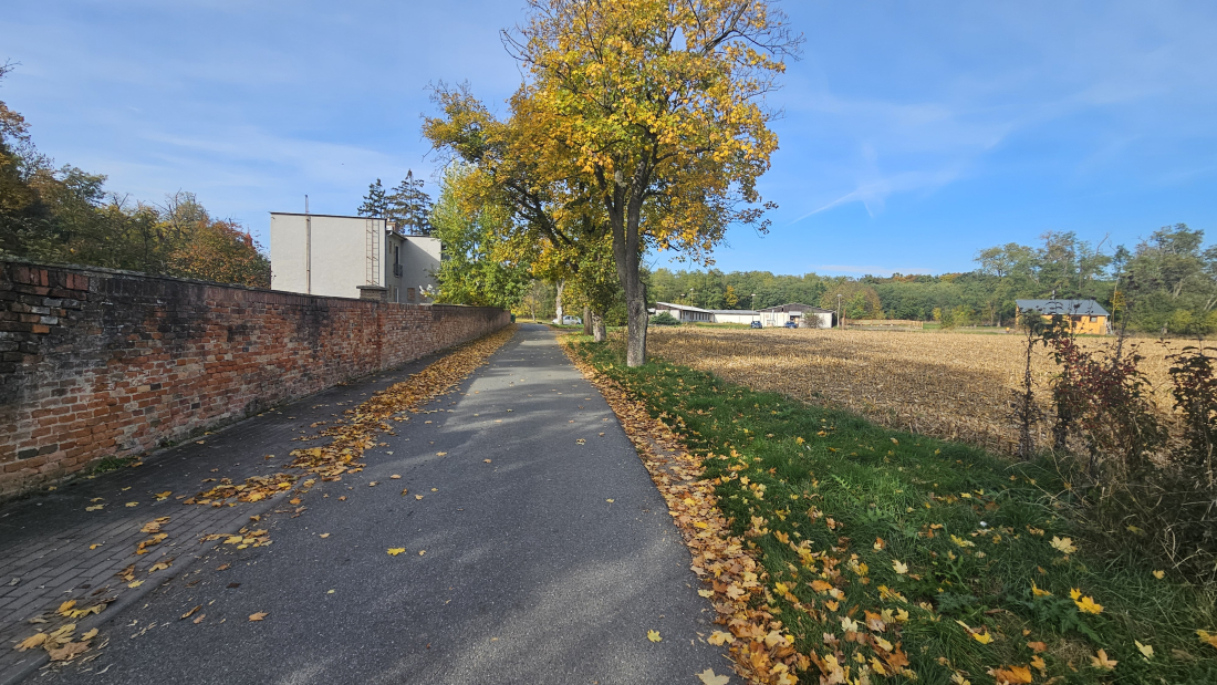 Lechovický a oleksovický katastr odděluje tato silnice. Nalevo stojí zeď parku lechovického zámku, napravo pole, které se má proměnit v developerský projekt v katastru Oleksovic. Obyvatelé plánovaných domů by přitom měli blíž do „sousedních“ Lechovic než do vlastních Oleksovic. foto: -bur-