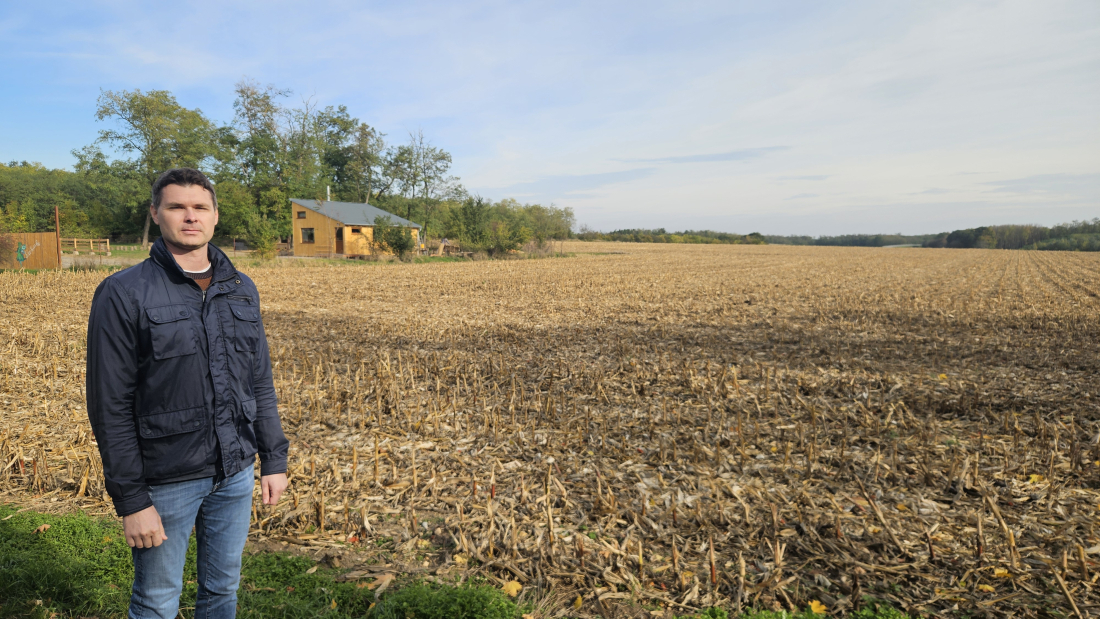 Starosta Lechovic Filip Vorlický u pole, kde má podle návrhu vyrůst nová obytná čtvrť Oleksovic s 31 rodinnými domy. V pozadí je vidět Lesní školka Lechůvka, která by s plánovanou zástavbou přímo sousedila. foto: -bur-