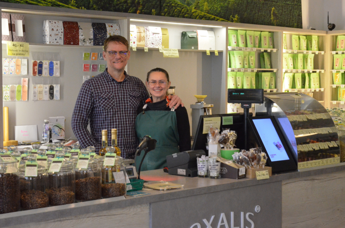 Provozovatel prodejny Oxalis na Divišově náměstí ve Znojmě Antonín Sikmund s manželkou.